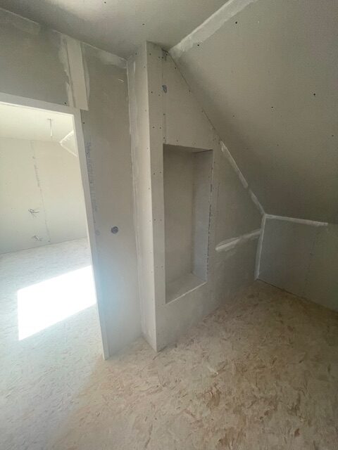 RC Plaquiste est intervenue à Ligné, près de Saint-Mars du désert ou Sucé sur Erdre, pour l’aménagement intérieur complet de plusieurs chambres, couloir et salon/séjour avec isolation et renforts spécifiques.